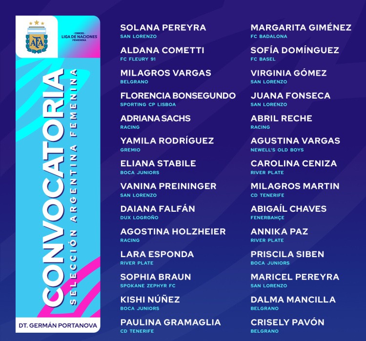 Bajo la dirección técnica de German Portanova, el seleccionado argentino se presenta con una convocatoria que combina experiencia internacional y figuras emergentes, como lo evidencia la nómina que incluye a talentos de ligas europeas como Aldana Cometti (FC Fleury 91), Florencia Bonsegundo (Sporting CP Lisboa) y Sophia Braun (Spokane Zephyr FC) junto a referentes del ámbito local y regional como Yamila Rodriguez (Gremio)y Eliana Stabile (Boca juniors). La presencia de jugadoras de San Lorenzo, Boca, River y Racing en la lista subraya la base sólida del fútbol de clubes en el país.