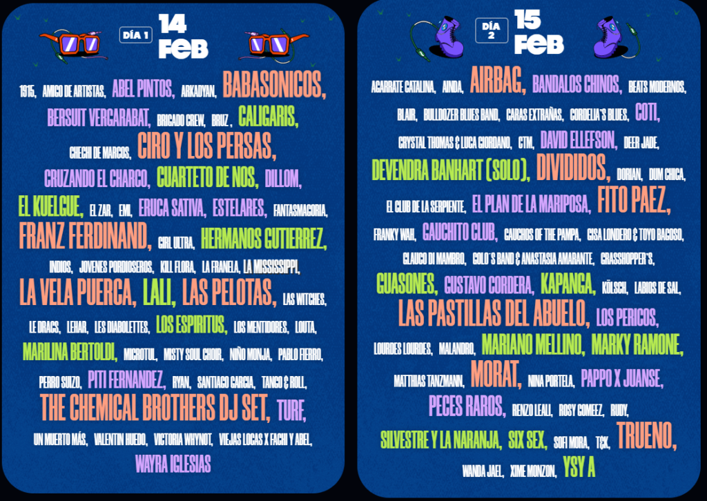 Durante dos jornadas, el festival reunirá a figuras consagradas, nuevas voces y proyectos emergentes, reafirmando su identidad como espacio plural y transversal. El viernes 14 tendrá como protagonistas a Babasonicos, Ciro y Los Persas, Divididos, Las Pelotas, La Vela Puerca, Dillom, Franz Ferdinand, El Kuelgue, Cuarteto de Nos, Lali y Los Espíritus, entre muchos otros, en una grilla que combina rock, pop, electrónica e indie.